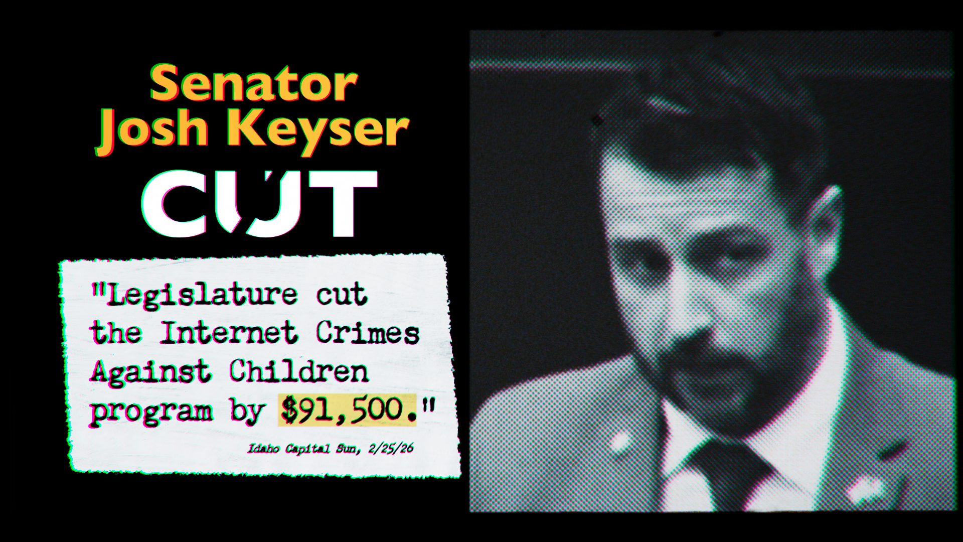 How did your state senator vote? Child protection funding report: S1157 cut the Idaho Internet Crimes Against Children (ICAC) Task Force budget. passing by a single vote. ICAC is the front line defense against online predators: - tracking cyber-criminals- rescuing children from sexual exploitation- training law enforcement Your senator’s record: SENator Josh Keyser VOTED to cut funds
